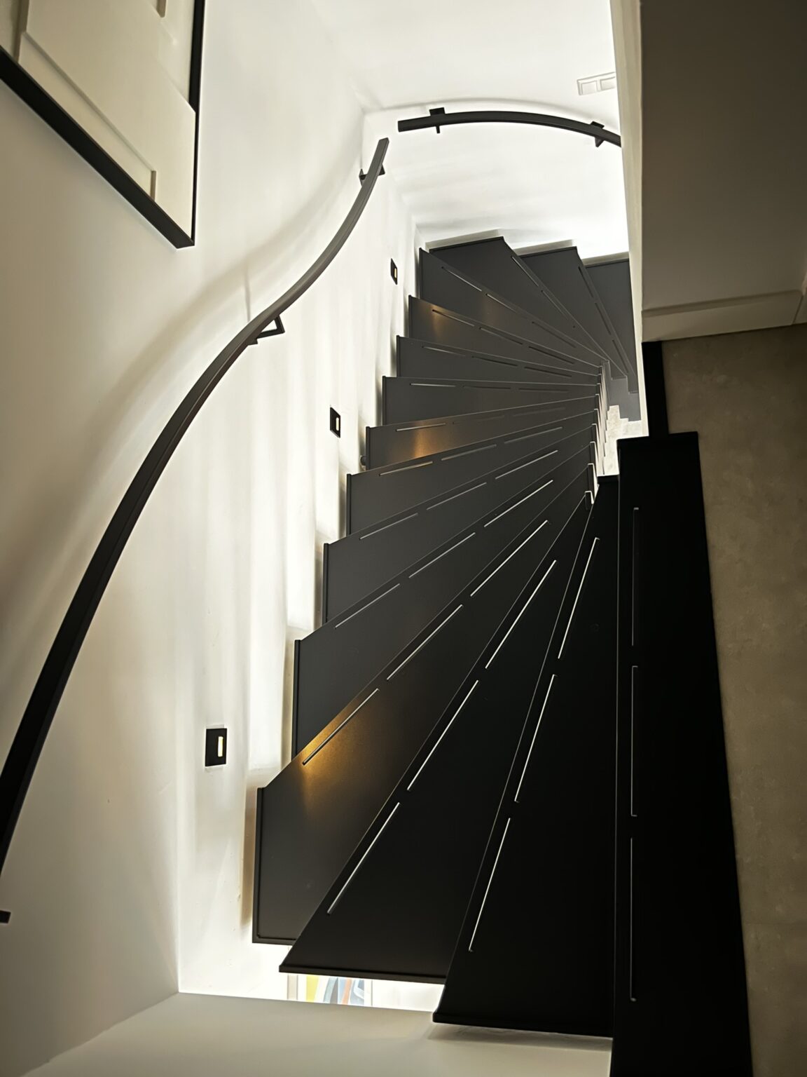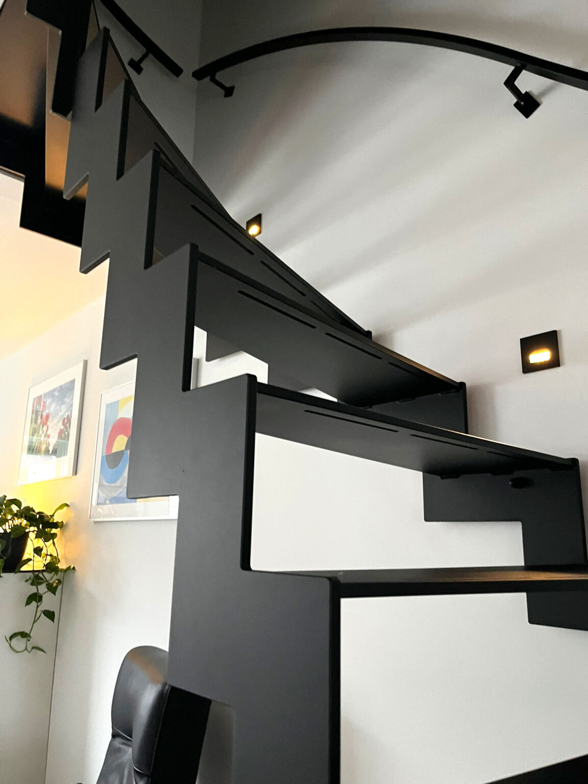 De treden zijn direct aan de trapboom gelast. Geen losse bevestigingen, geen zichtbare schroeven of overgangen. Alles is één geheel. Dat geeft de trap z’n robuuste, industriële karakter. De mat zwarte poedercoating maakt het af en past goed bij het interieur: betonlook vloer, donker meubilair.