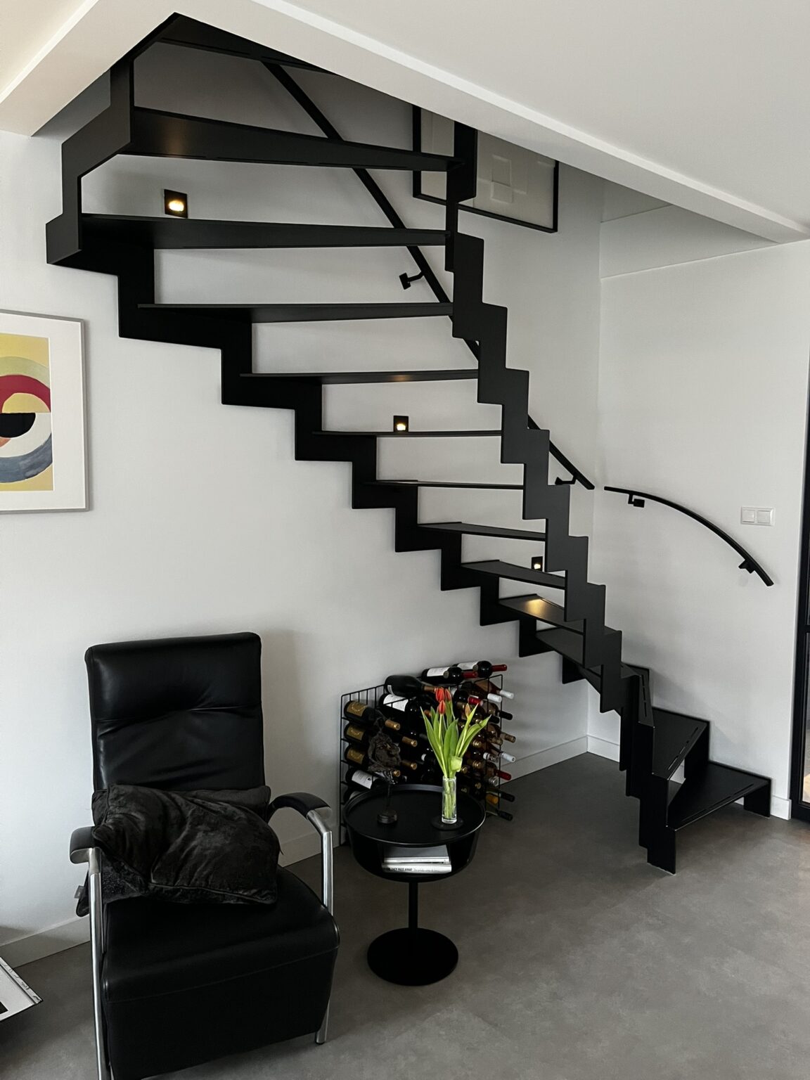 In een woning in Marknesse hebben we een stalen trap gemaakt met onderkwart en bovenkwart. Volledig in staal, mat zwart afgewerkt, met een stoere en strakke uitstraling.