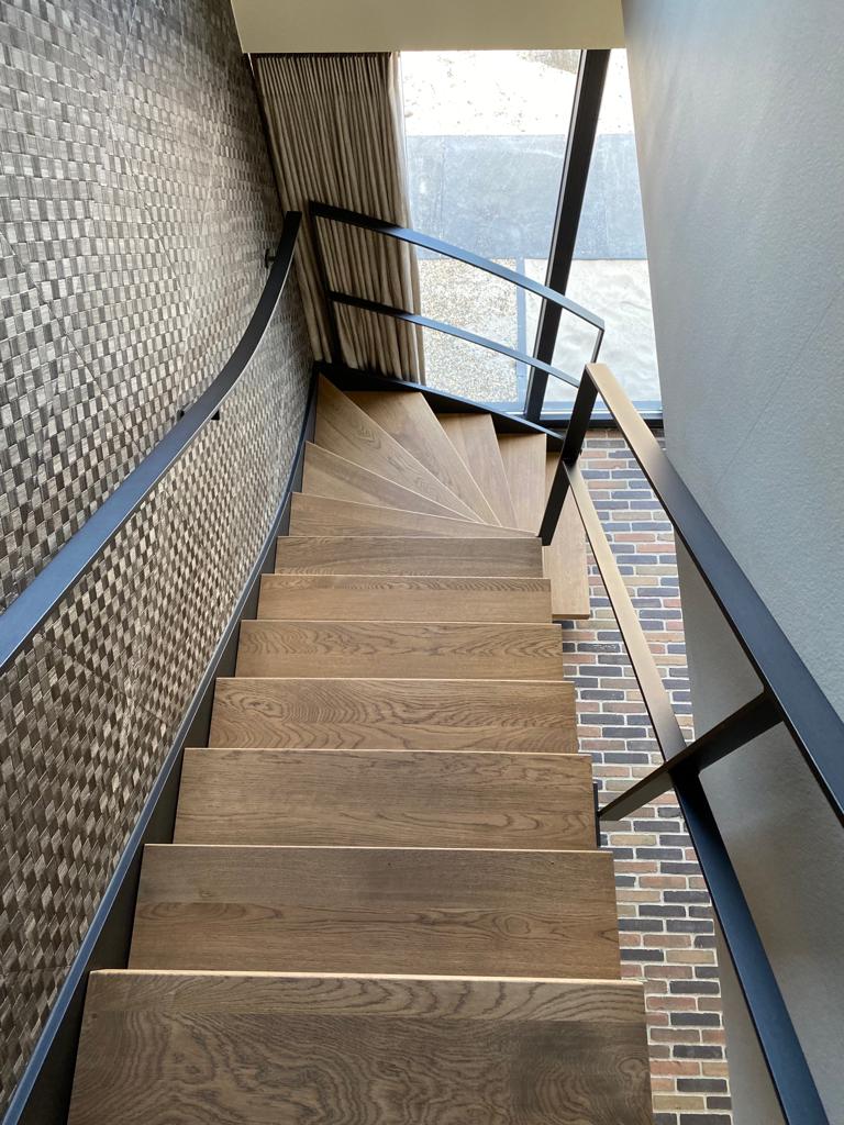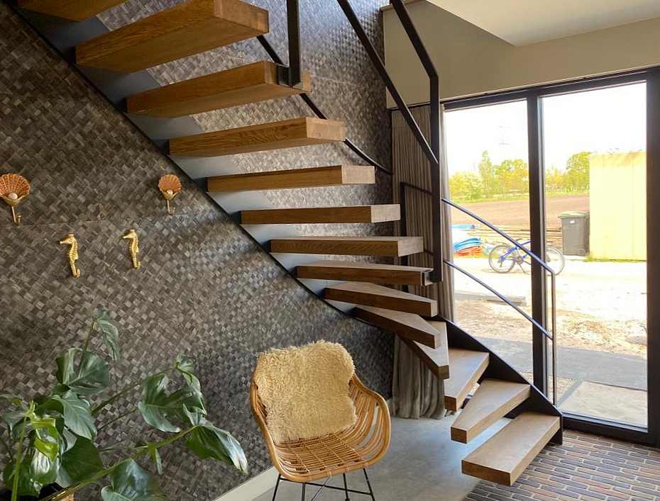 Dankzij de onderkwart wordt de beschikbare ruimte optimaal benut, terwijl de open constructie met zwevende treden zorgt voor een ruimtelijk en open gevoel in de gang.