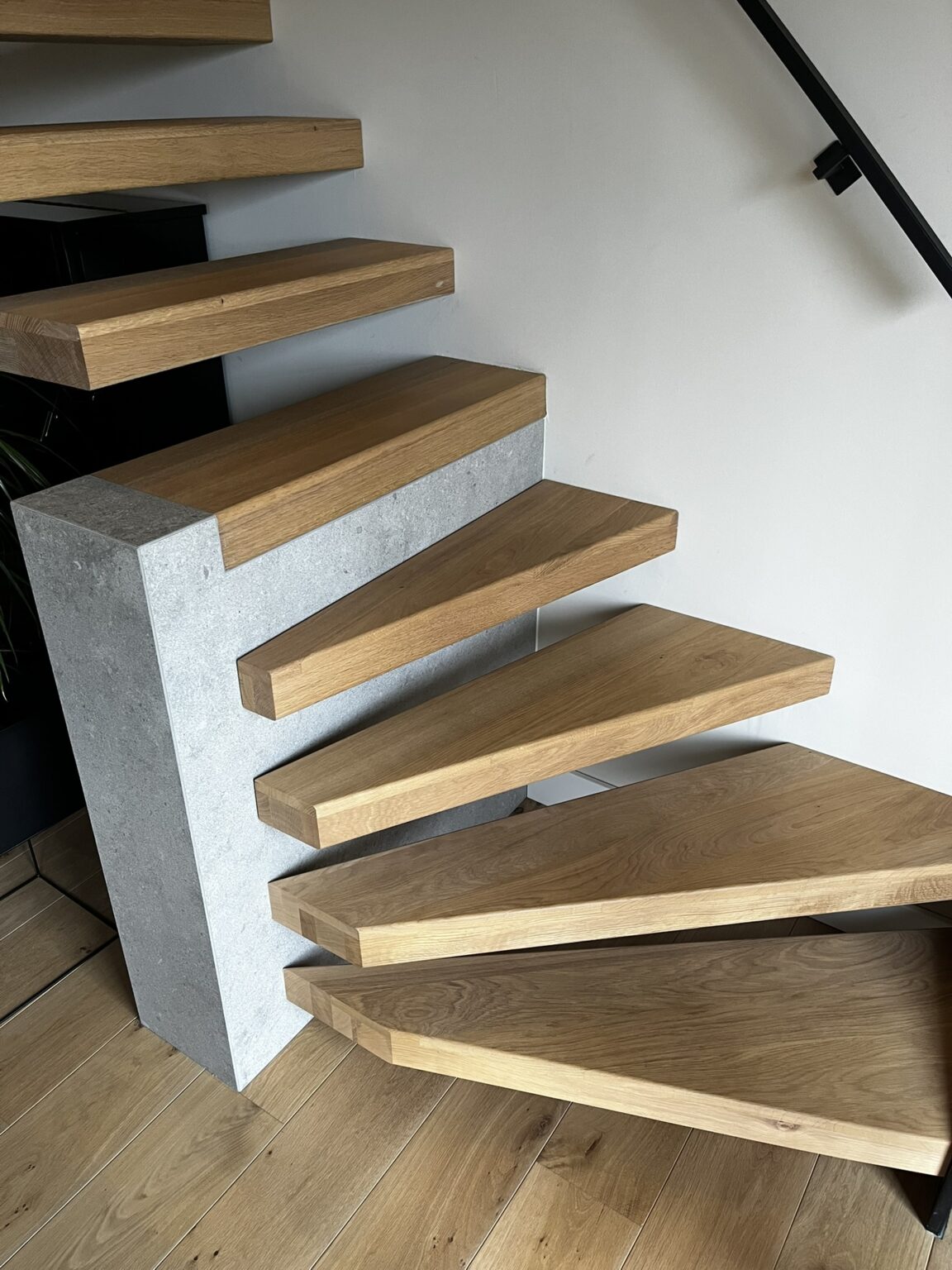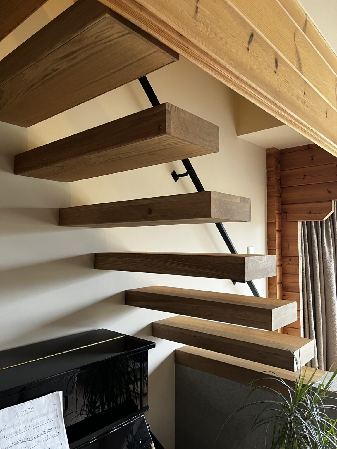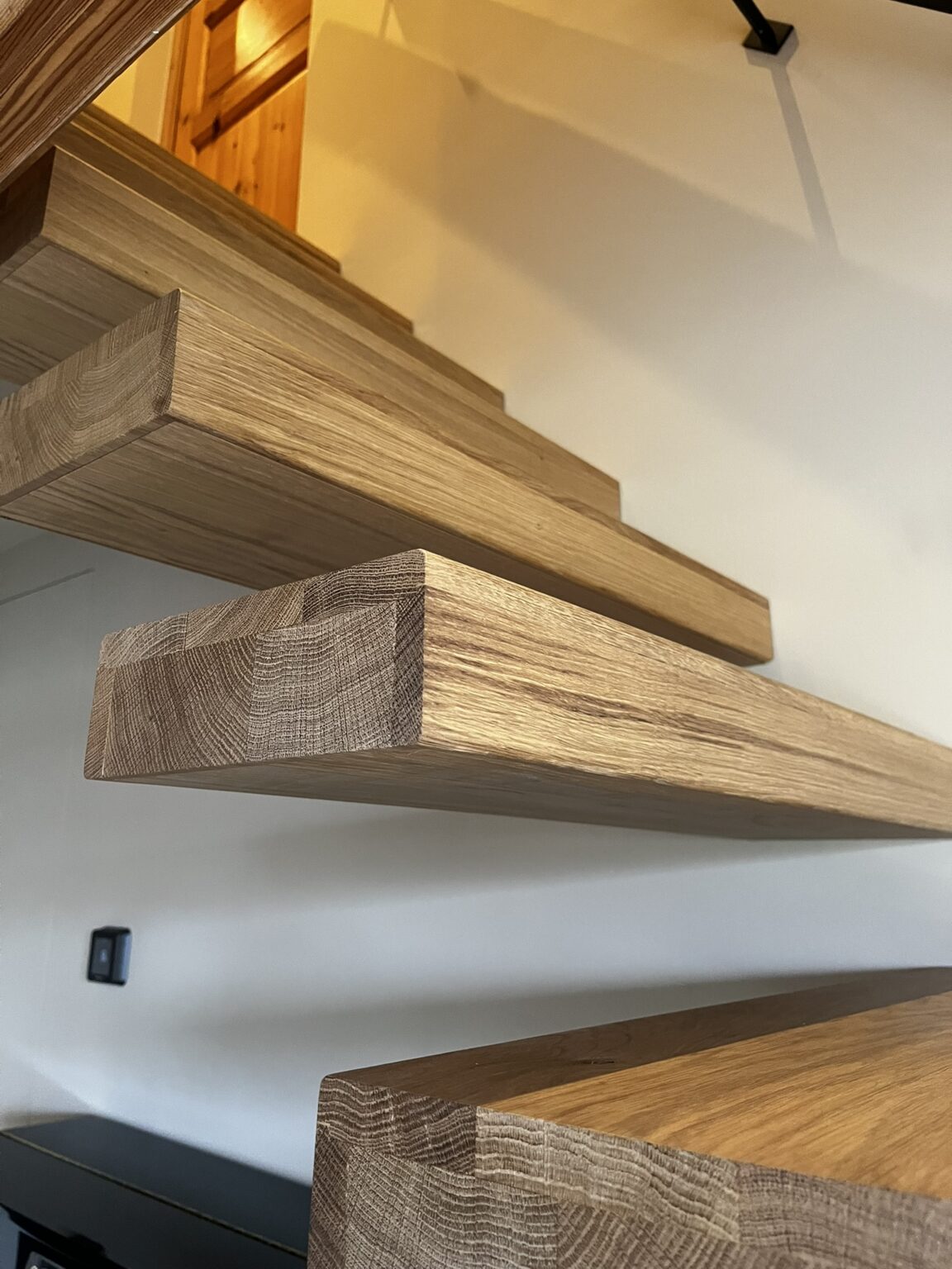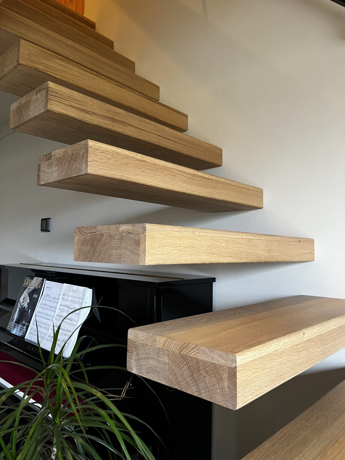 In een volledig houten woning in Lemmer hebben we een zwevende trap geplaatst met massief eiken treden. De trap is een blikvanger: de bewoners krijgen er regelmatig complimenten over van bezoek.